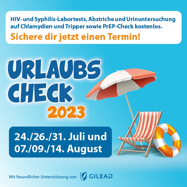Auch in diesem Jahr sind wieder spannende und informative Veranstaltungen im CSD-Rahmenprogramm geboten. Begonnen wird mit dem „Urlaubscheck“. An diesen Tagen (24.07., 26.07., 31.07., 07.08, 09.08. & 14.08.) erhalten Männer, die Sex mit Männern haben, und trans* Personen kostenlos einen HIV- und Syphilis-Labortest, einen Abstrich und / oder eine Urinuntersuchung auf Tripper und Chlamydien bzw. den gesamten PrEP-Check.