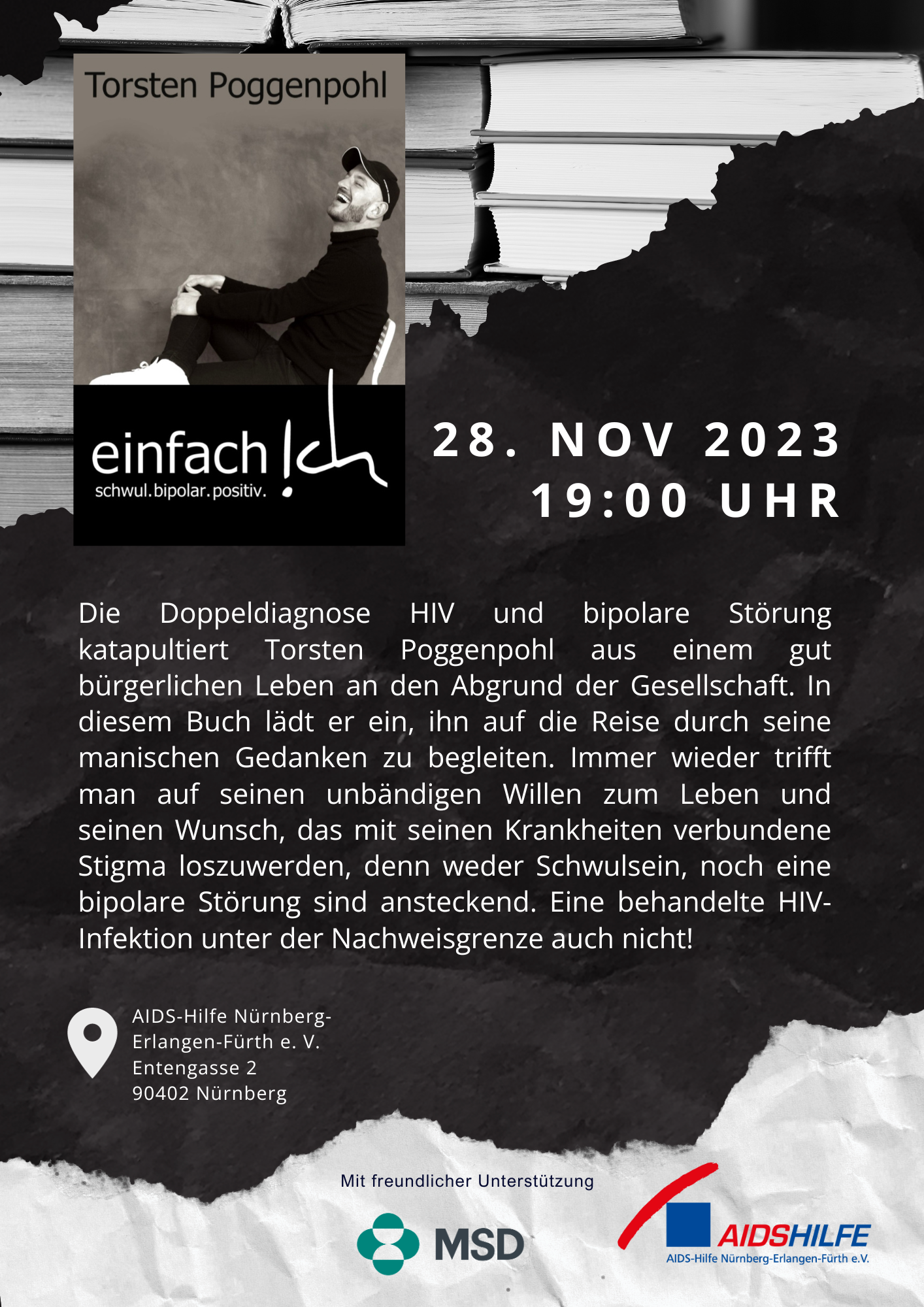 Freut euch auf einen erfrischend offenen und ehrlichen Abend. Das Buch, welches die Leser*innen mit auf die Achterbahnfahrt seines Lebens nimmt, um dann den Weg raus aus diesem Nirwana zurück in eine neue Normalität aufzuzeigen, spendet Zuversicht. Also nur Mut. Vergesst eure Vorurteile und Stigmata.