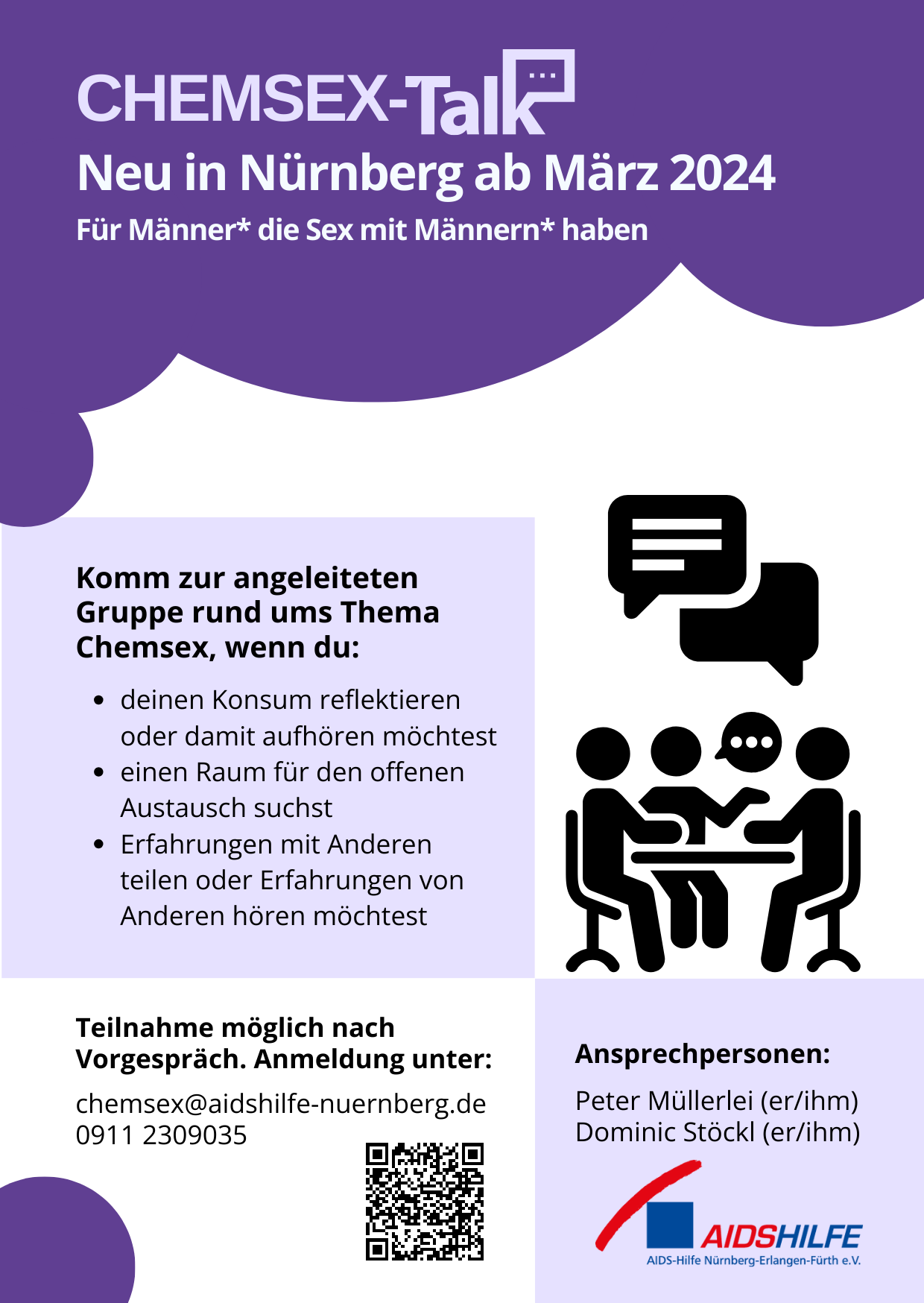 Ab März 2024 bietet die Chemsex-Beratung ein alle zwei Wochen stattfindendes Gruppenangebot für Chemsex-User in der AIDS-Hilfe, Entengasse 2, an.